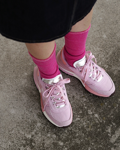 キラリと輝くメタリックのホイルタンがさりげないアクセント。ナイロンとスエードを組み合わせたアッパーは、軽やかさと奥行きを両立し、どこか懐かしくも洗練された印象に。