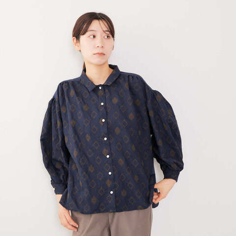 どこかレトロであたたかみのある刺繍の総柄が印象的なブラウス。