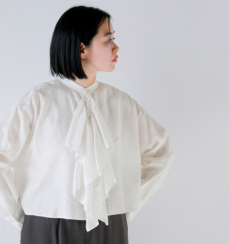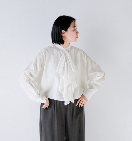 柔らかで上品な風合いのリネン素材を使用することで、フェミニンな印象を持ちながらも甘くなりすぎず、凛とした大人の雰囲気に。軽やかな着心地と程よい透け感が、季節感のあるスタイルを演出してくれます。