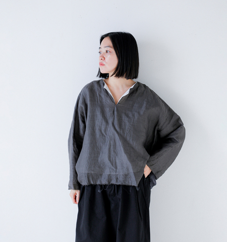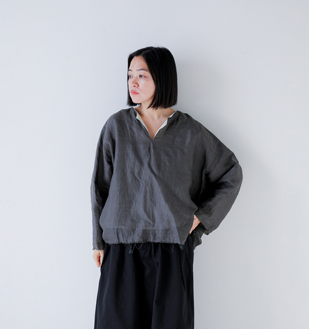 HAVERSACK(ハバーサック)より、ラミーツイル リバーシブル プルオーバーシャツのご紹介です。エッジの効いたディテールが印象的なプルオーバーシャツ。すっきりとしたVネックラインに切りっぱなしの仕様を組み合わせることで、程よくモードな雰囲気を纏える一着に仕上げられています。裏表をひっくり返すことでリバーシブルで着用可能。表情の異なる2つの面を楽しめるため、その日の気分やスタイリングに合わせた着こなしが叶います。ラミー素材特有の軽やかさとシャリ感があり、季節の変わり目にも心地よく取り入れられるアイテムです。