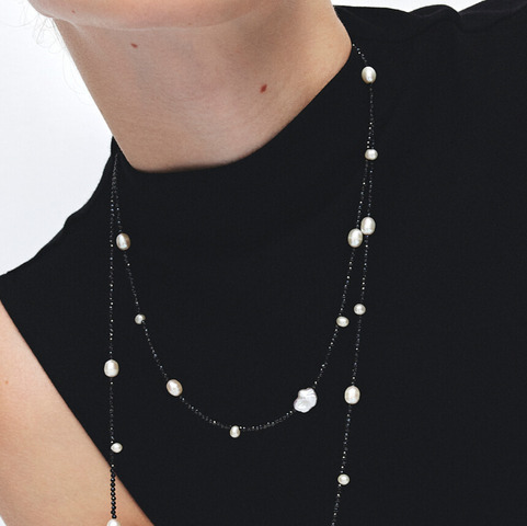 ブラックスピネルと淡水パール、異なる質感が交差するネックレス。