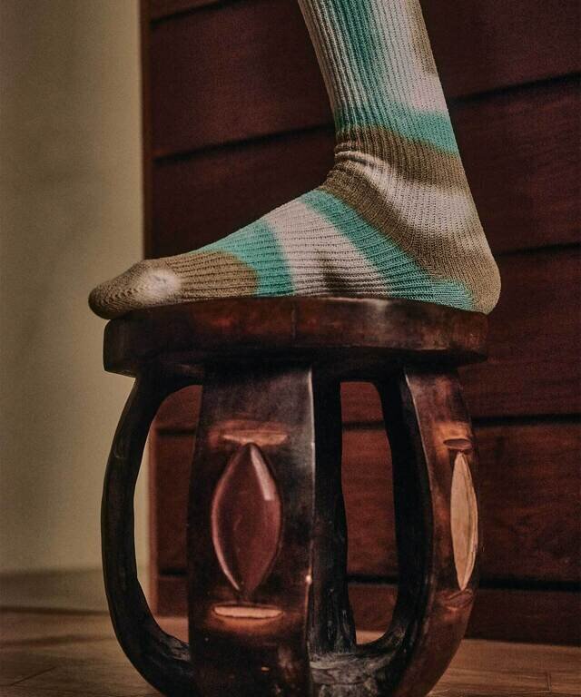 シャリシャリしたクリスプ触感が特徴。ルーズに履いてリラクシーかつ上質なムードを提案します。タイダイ染め専門工場にて丁寧に染め上げました。ひとつひとつ表情が異なり、プレイフルな足元にしてくれます。
