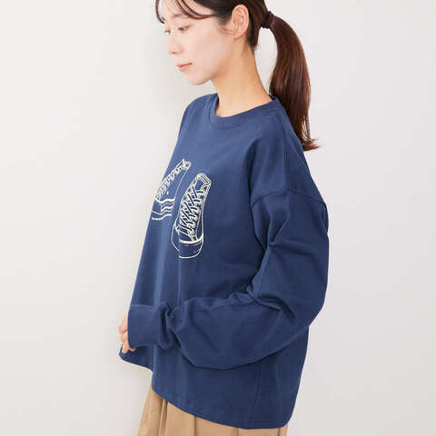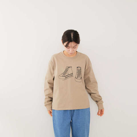 胸元に描かれたスニーカーのイラストが印象的で、シンプルながらも個性が光るデザイン。
