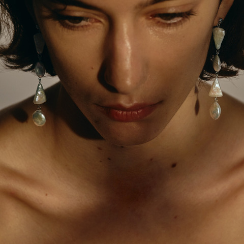 海の恵みを感じさせる淡水パールを、円と三角のグラフィカルな造形で再構築。