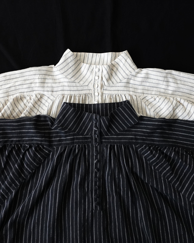 細かなストライプに、たっぷりとギャザーを寄せたふんわりした袖とフロントのクルミボタンがアクセントになったブラウス。