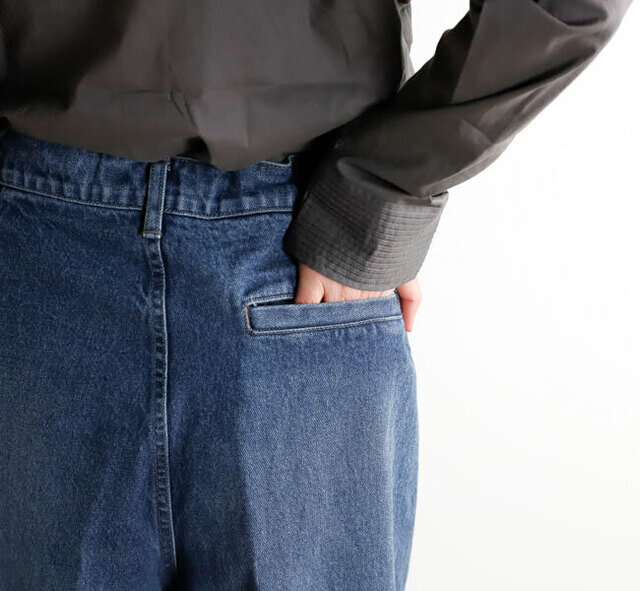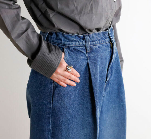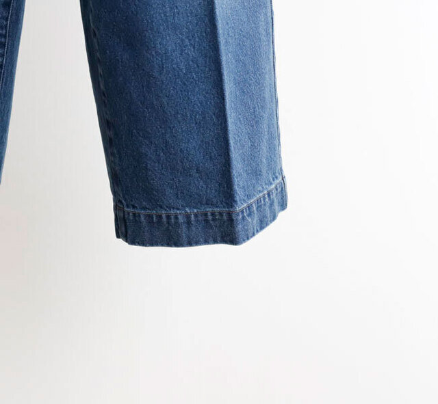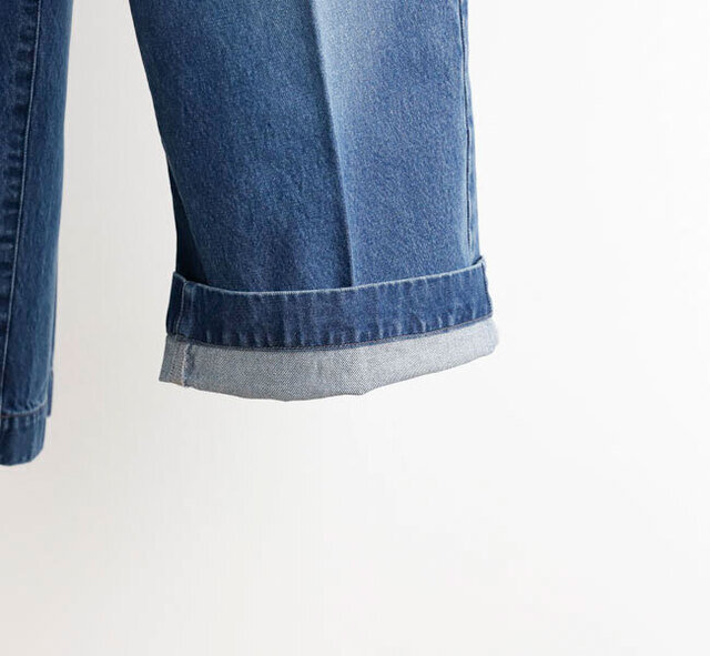 センタープレス入りのスラックスをベースにすっきりとしたラインが上品な印象。カジュアルからきれいめまで幅広く対応するデニムパンツです。内側には紐を配し、ウエストサイズの微調整が可能。快適さと実用性を兼ね備えています。岡山製の上質な13オンス生地を使用し、しっかりとした風合いと安心感のある穿き心地が魅力の一枚です。