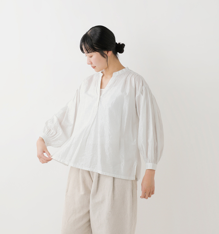 襟周り、アームホール、カフス部分にはたっぷりとギャザーを施し、空気を含んだような立体感のあるシルエットに。