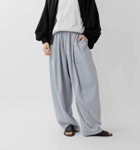 たっぷりとした分量感が生み出す、立体的で存在感のあるバルーンシルエット。落ち感のあるヴィンテージツイル素材を使用することで、ボリュームがありながらも重く見えず、洗練された印象に仕上げています。ウエストは総ゴム仕様に加え、ドローコード付きでフィット感の調整も自在。リラックスした穿き心地ながら、ラフになりすぎないデザインです。