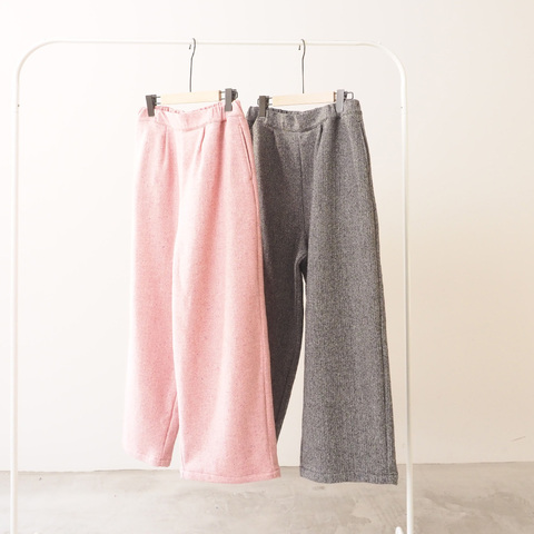 やわらかな落ち感のワイドシルエットが歩くたびに表情を変え、ヘリンボーンネップの素材感が日常のコーデにさりげない温もりと品を添えます。