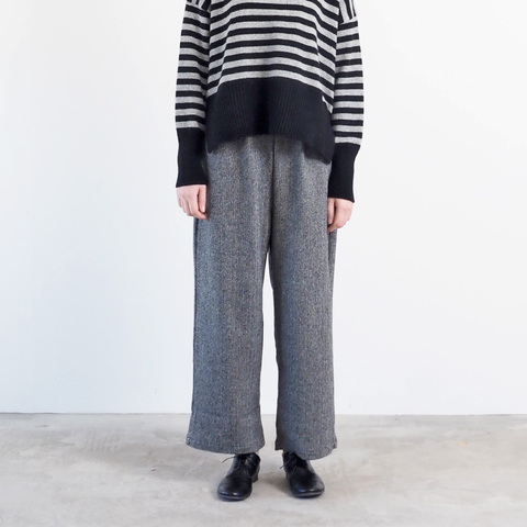 ヘリンボーンの織り柄にさりげなく散りばめたネップの表情のある、ヘリンボーンネップツイード ワイドスラックスです。 シルエットは、腰まわりにゆとりを持たせたワイドスラックス。落ち感のあるラインが、ラフになりすぎず、きちんと感もほどよく残してくれます。ボーダーニットやベスト、カーディガンなどとのレイヤードとも相性抜群。