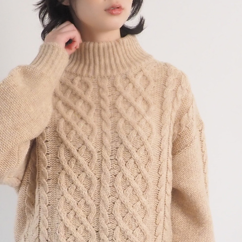 立体感のあるケーブル編みが、ニット全体にやさしい表情をプラス。中央に配置された編み柄が縦のラインを強調し、自然とすっきりとした印象に。