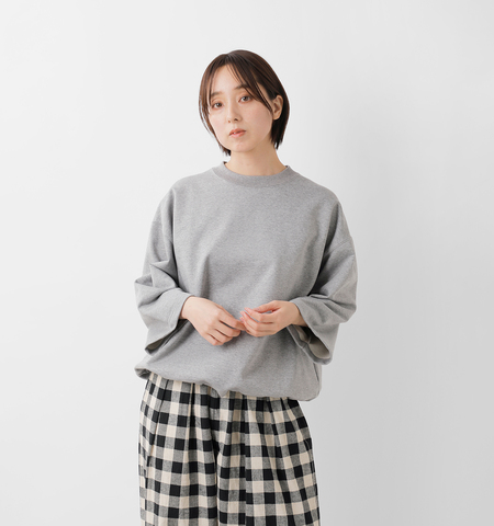 素材には、表面がきめ細かく、ほんのりと光沢感のあるコットン100%のスウェット生地を使用。厚手すぎない程よい肉感で、ロングシーズン活躍する「きれい見え」素材です。