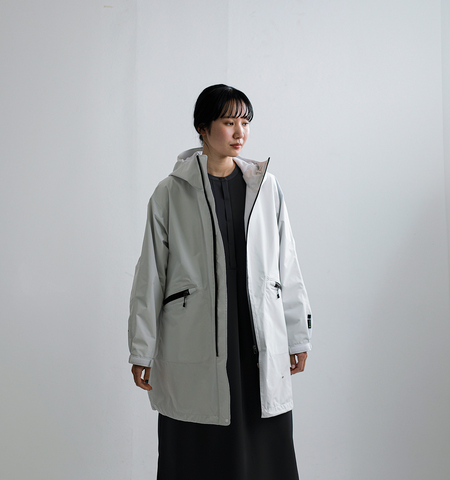 環境配慮型の50デニール・リサイクルポリエステルの表生地を組み合わせた2層構造のGORE-TEXを使用。耐水性と防風性と同時に軽量性を実現しております。環境配慮型の撥水剤を使用。テカリのないマットでクリーミーな質感でタウンユースにも馴染みます。