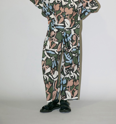 顔料染め(ピグメント加工)を施した生地にフラワーモチーフをプリントし、奥行きのある色合いとヴィンテージライクな表情に仕上げた一本です。シンプルなトップスと合わせるだけでコーディネートの主役になり、シャツやジャケットと合わせればモード感のある着こなしにも対応。
