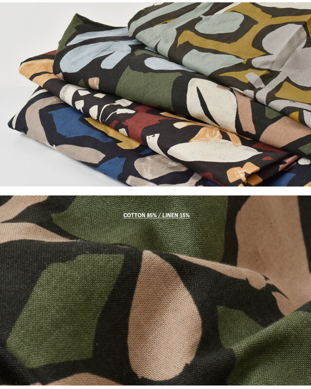 シーチング生地に顔料でフラワープリントを施した生地を使用。アートタッチな花柄プリントをデリケートに扱わず、USED製品を扱うようにイージーに捉え、洗い・着用する度に表情に変化が現れ、経年劣化が楽しめるギャップのある商品に仕上がりました。カジュアルでありながらも、素材感で上品さを感じさせる、my beautiful landletらしい雰囲気の生地です。