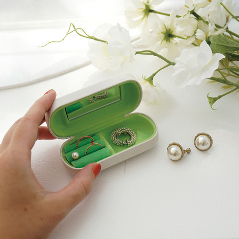 ころんとした形で、手に馴染む合皮素材を使用しています。仕切り付きで、指輪や小さめのピアス・イヤリング等のアクセサリーを分けて収納可能。お出かけや旅行のときのアクセサリーの持ち運びに役立ちます。