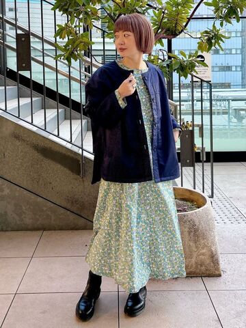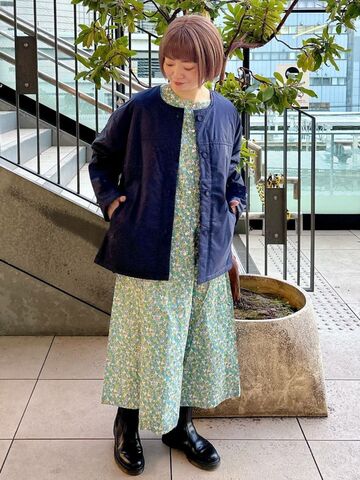 インナーには、グリーンベースの花柄が目を引くヨーク前あきワンピースを。
