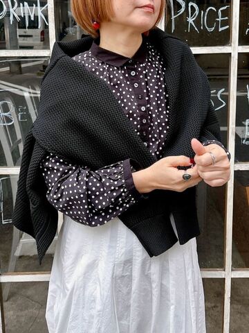 インナーには、ドット生地にミックスボタンが映えるブラウスを。