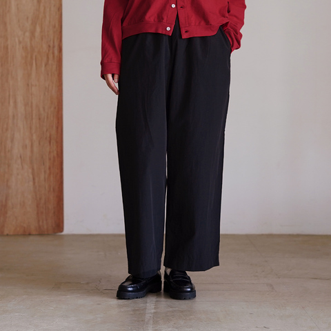 コットンナイロンの高密度平織生地を使用し、軽くさらっとした肌触りが特徴。夏の暑い日も快適に穿け、日中のリラックスタイムからおうち時間まで幅広く活躍します。
