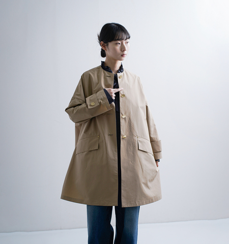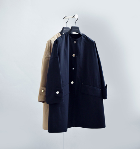 高い人気を誇るドロップショルダーのコート「HUMBIE」を、軽快なショート丈のノーカラーデザインに昇華。