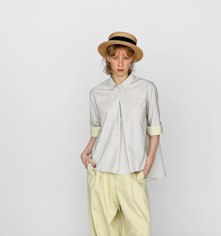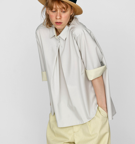 台襟付きのシャツカラーで、釦を開けるとざっくりとしたオーバサイズのシャツに。2wayでお楽しみいただけるデザイン。