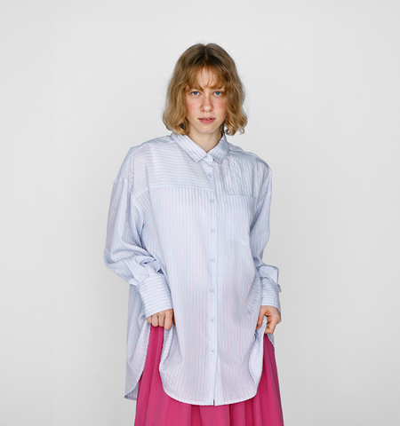 軽やかでソフトな肌触りが特徴で、春夏シーズンも快適に着用いただけます。繊細なストライプ柄が上品な印象を与えつつ、空気を含むような柔らかさで、動くたびに自然な表情を演出。見た目にも涼しげで、シャツとしてはもちろん羽織りとしても活躍する素材感です。