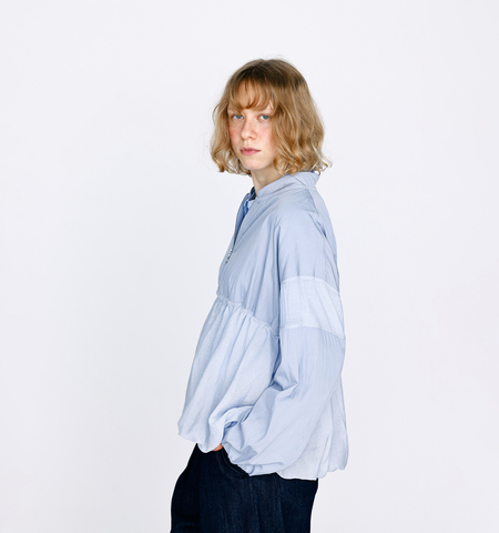 スリーブには透け感のあるシアー素材の切り替えを施し、遊び心のある表情に。ふんわりとしたゆとりを持たせつつ、シャーリングで程よく絞ることで、可愛らしいバルーンシルエットを演出します。