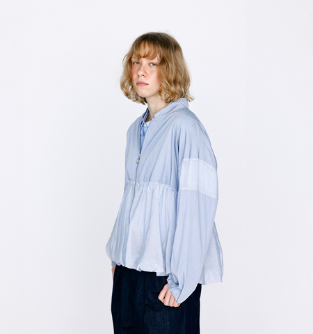 袖口裏に施したシャーリングが自然な膨らみを生み、折り返して作られた裾のバルーンデザインが、全体を丸みのある女性らしいシルエットに。フェミニンな素材感に、メンズライクなブルゾン襟を合わせることで、クリーンにもカジュアルにも対応するバランスの取れた一着に仕上がっています。両脇内側にはドローコードを配し、絞ることでシルエットの変化も楽しめます。