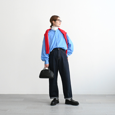 女性の体型に合わせて再設計したドロップショルダーにボリュームのあるボックスシルエットで凛とした表情のバンドカラーシャツ。