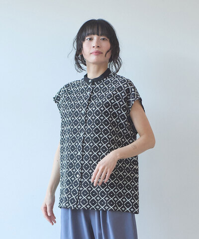 yuni|コットン/ナイロン sheer floral刺繍 half sleeves シャツ 1701BL013261