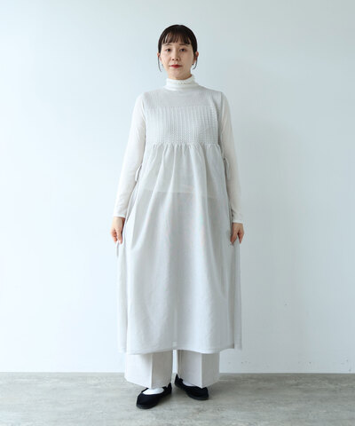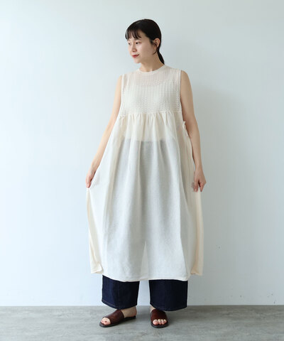 2つの異なる透かし模様の編み地と天竺編みを組み合わせた、軽やかなティアードワンピース。