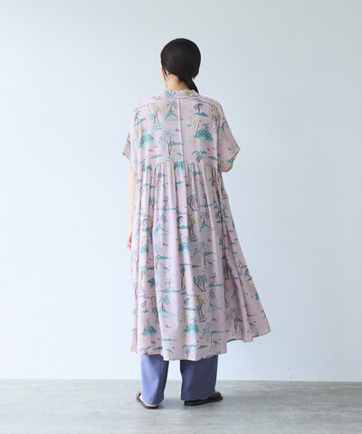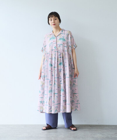 オープンカラーで首まわりをすっきりとさせ、“Alohaシャツ”をワンピースにしたようなデザイン。