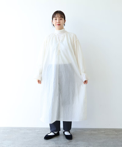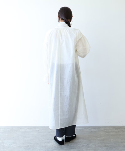 首元と肩の切り替えからたっぷりと入れたギャザーが、素材の持つ張り感を活かし、優雅でゆったりとしたシルエットを生み出すワンピース。