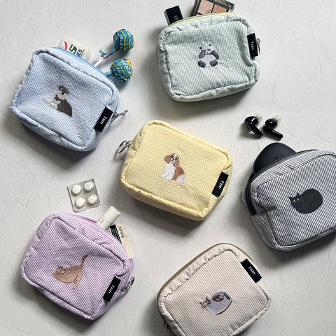 さわやかなストライプ柄ポーチと動物刺繍の組み合わせがかわいい!手のひらサイズの小さ目ポーチ