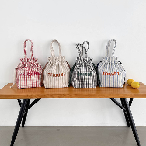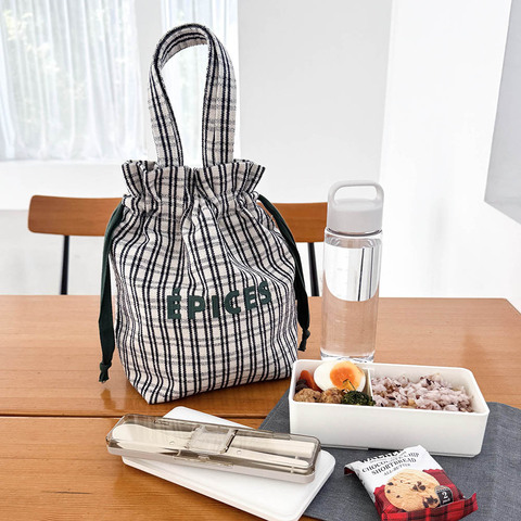 粗目の織り生地と巾着型の組み合わせで、お弁当バッグらしさを感じさせず、普段のお出かけにも使えるデザインです。
