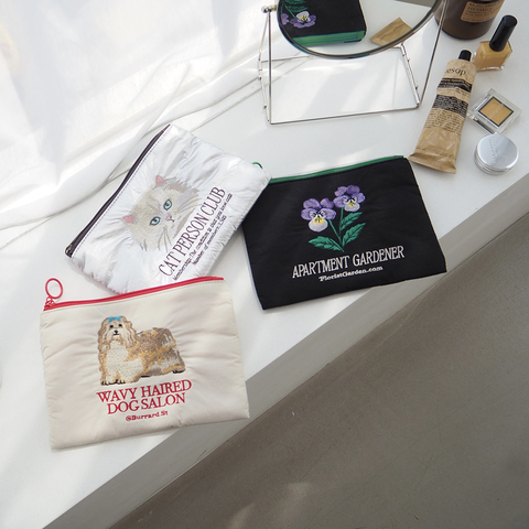 マチ無しのすっきりしたフラットポーチは、バッグに入れてもかさばらず持ち歩きに便利。軽量でふっくらと厚みのあるボンディング生地を使っているので、中に入れる物を守る緩衝材の役割も◎