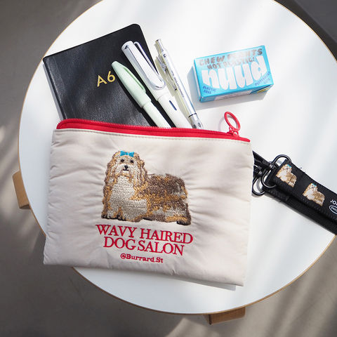 ウェービーヘアーと水色のリボンが可愛いワンちゃん柄は、北米で見かけたトリミングサロンの看板をイメージ。英字のサロンメニュー等もデザインに取り入れ、細部までこだわりました!