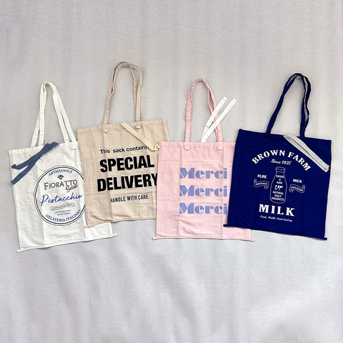 フランス語で「ありがとう」を意味する感謝の言葉「Merci」がプリントされたデザイン。くすんだピンクとペールブルーの文字の配色が可愛いです。