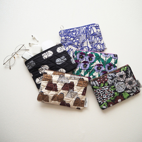 さらっとした表面のキルティング生地に、大胆な色遣いのフラワー柄、いぬ、ねこ柄をプリントした全5種類。