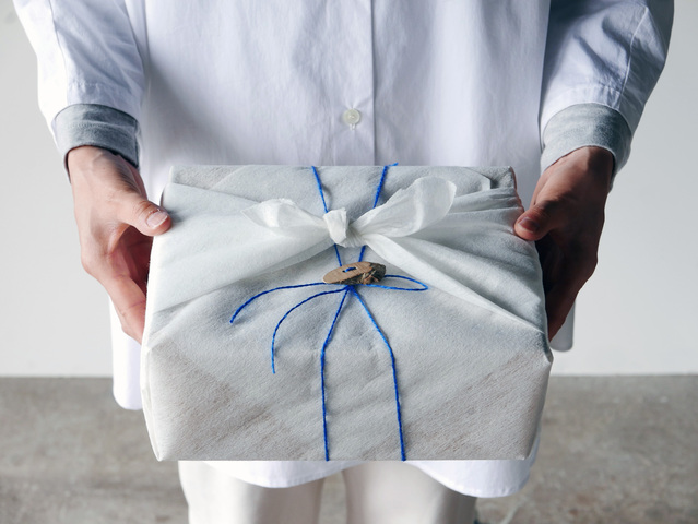 - 白無地の不織布包み(風呂敷 or 袋)に青色の紐をかけます。小さな「木」のチャーム・お渡し用手提げ紙袋付き