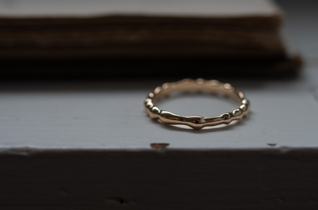 流れ続ける時間の中で、ふと立ち止まるようなひとときをかたちにした指環です。 均一ではない線や、わずかな起伏を残した輪郭が、 つけるたびに異なる表情を生み出します。 完成されたかたちではなく、身につける人の時間とともに変わり続けること。 それが、時のあわいの指環の在り方です。 素材には、やわらかな色合いをもつ**10金(K10)**を使用しています。