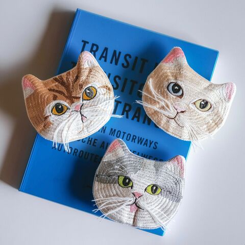 生き生きとした猫たちの表情や、手刺繍ならではの立体的であたたかな毛並み。その魅力あふれるディテールを大切になぞりながら、機械刺繍で再現しました。