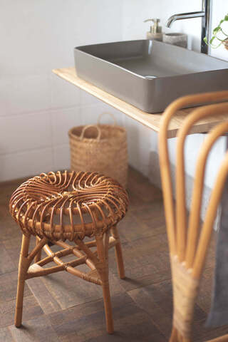 希少価値のある皮付きラタン(籐)製。ハンドメイドの特性上、一つ一つの形状、サイズ、太さに個体差があります。斑点や、色ムラも自然素材の特徴です。軽くて吸湿性に富み、表面をさらりと保ってくれるラタンなので、洗面室などにも気軽に置いて頂けて、女性でも簡単に持ち運びできます。