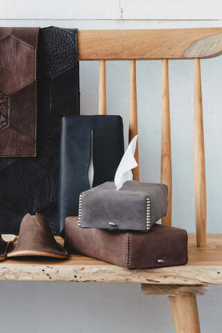 銀すり加工を施した、スモーキーな表情のレザーを使い、ハンドメイドで仕立てられたTEHA’AMANA(テハマナ)のティッシュカバー。