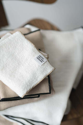 さらりと心地よいガーゼ面と、しっかり水分を吸収するパイル面を組み合わせた仕様。染めを施さないホワイト生地にブラックのかがりをあしらったoff×black、同じくブラックのかがりにコーヒー染めの落ち着いた色合いを添えたcoffee×blackの2色からお選びいただけます。