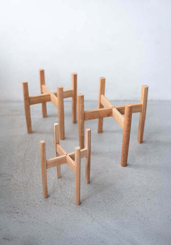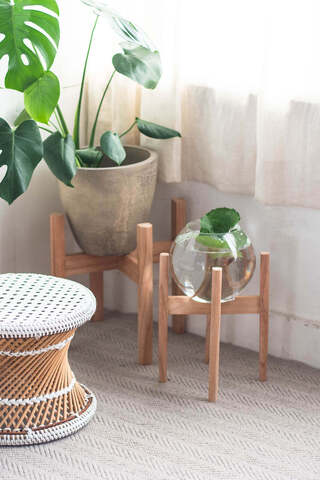 シンプルな佇まいで、植物の存在感を引き立てる木製の植木鉢スタンド。