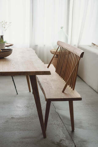 幅のあるベンチは、チェアのように1脚1人と限定せず、複数人で座ることができるのが特徴です。来客時にもチェアを増やすより省スペースで座る人数を増やすことができます。また、「大皿をシェアする時には真ん中に寄る」、「少し距離を取って作業スペースを確保したい時には端に座る」など、その時々の気分や状況に合わせて腰かける場所を自由に決められるのもベンチの魅力です。