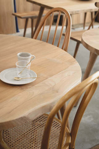 素朴な雰囲気を楽しんでいただけるよう無塗装で仕上げました。チークの風合いとナチュラルな色合いはどんな部屋にも馴染み、心地の良い上質な空間を演出します。白けた質感は多彩な表情を見せてくれるので、ファブリックや食器を変えて季節ごとのインテリアを存分に楽しんでいただけます。