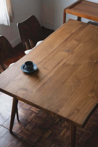 チーク材の美しい風合いと木目を生かした、シンプルで洗練されたデザインのダイニングテーブル。丹念にサンディングされ、滑らかな手触りに仕上げました。あえて残した耳は、天然の木材の魅力を引き立て上品な佇まいに。