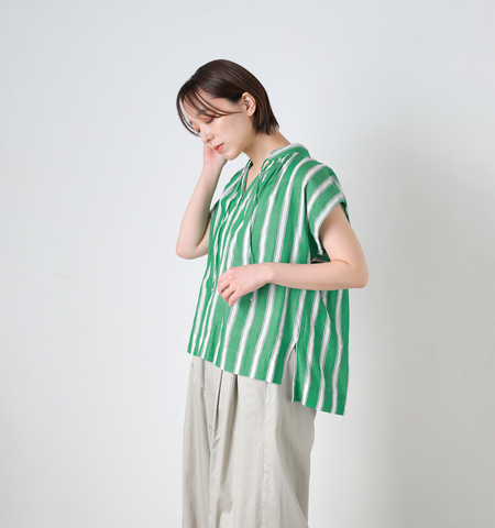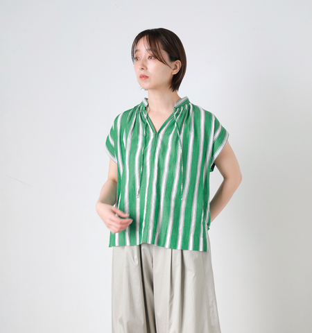 ブランドが得意とする色鮮やかなインド製のストライプ生地をリラクシンで美しいブラウスに仕立て上げました。